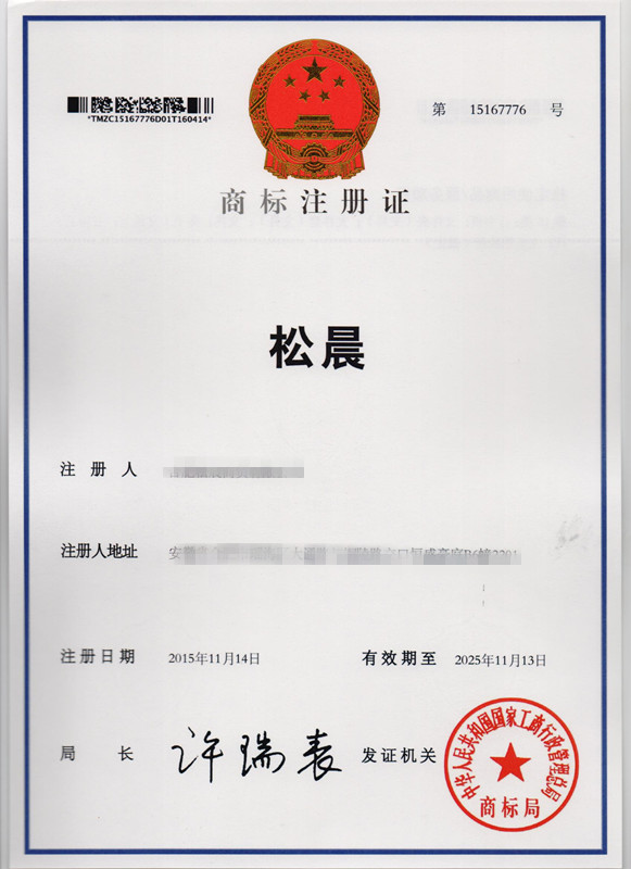 第16类“松晨”商标注册证