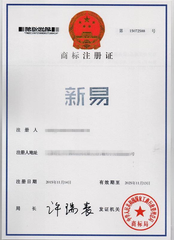 第12类“新易”商标注册证