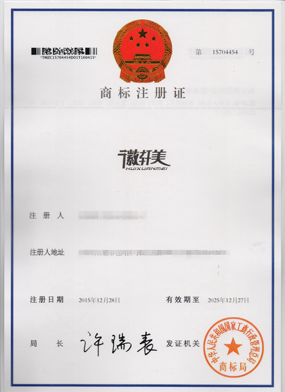 第29类“徽轩美 HUIXUANMEI”商标注册证