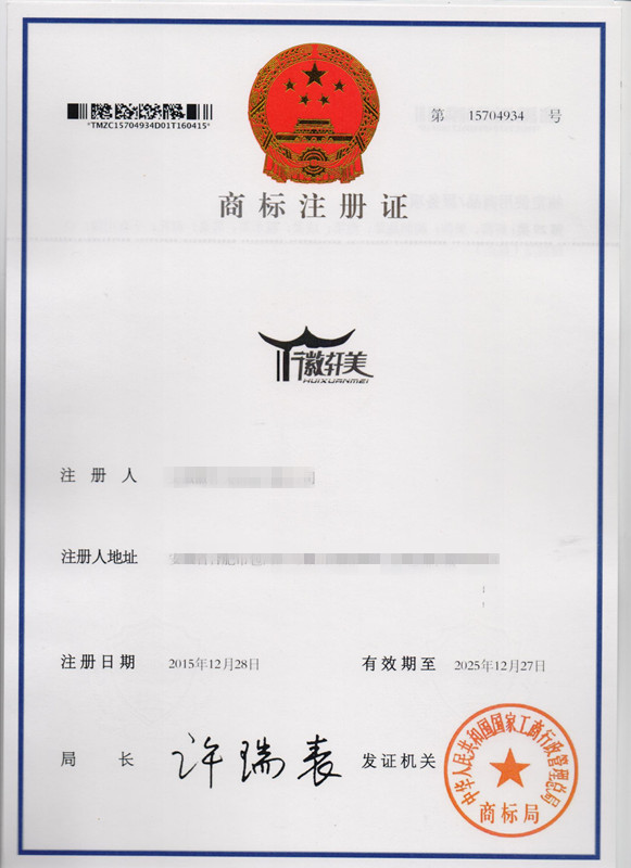 第29类“徽轩美 HUIXUANMEI”及图形商标注册证