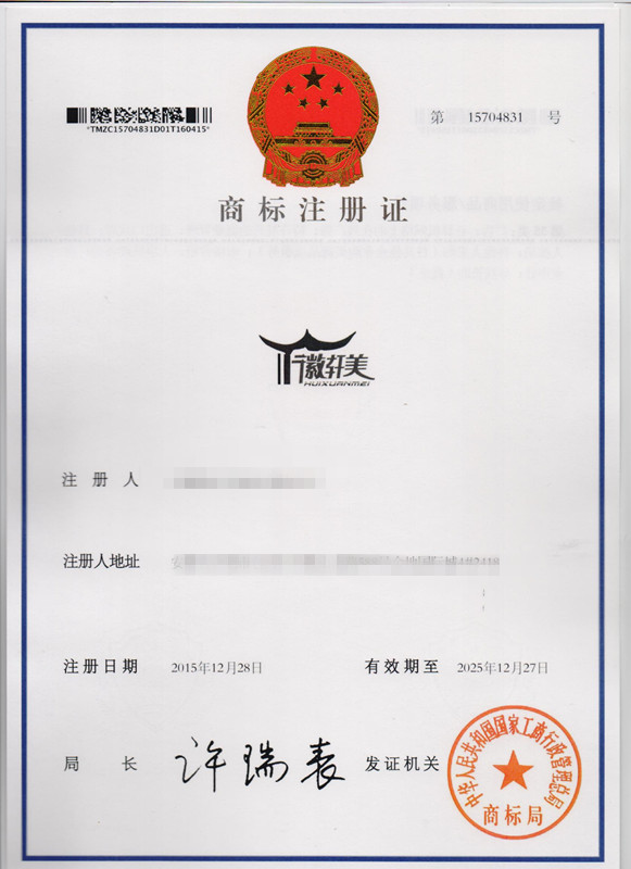 第35类“徽轩美 HUIXUANMEI”商标注册证