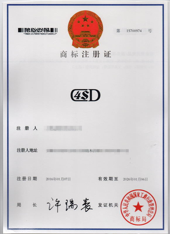第16类“4SD”商标注册证