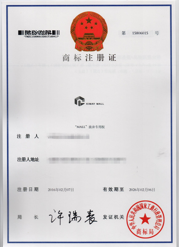 第25类“KIMAY MALL”及图形商标注册证