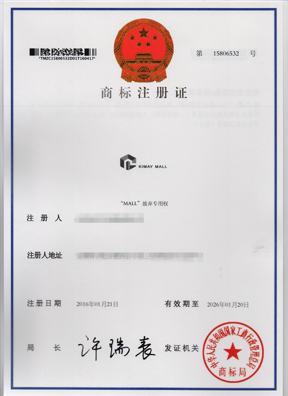 第35类“KIMAY MALL”及图形商标注册证