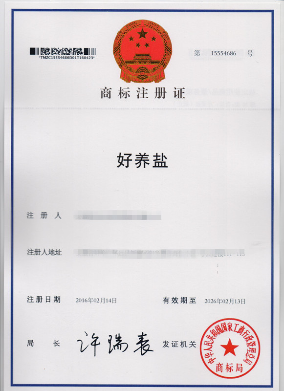 第30类“好养盐”商标注册证