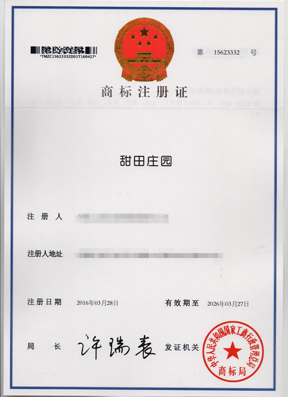 第30类“甜田庄园”商标注册证