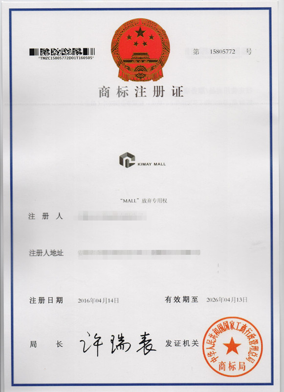 第20类“KIMAY MALL”及图形商标注册证