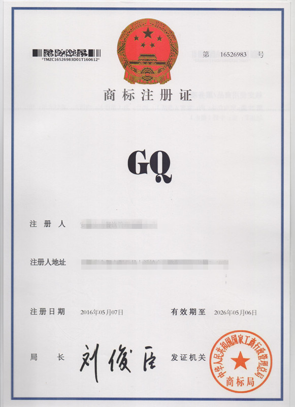 第29类“GQ”商标注册证