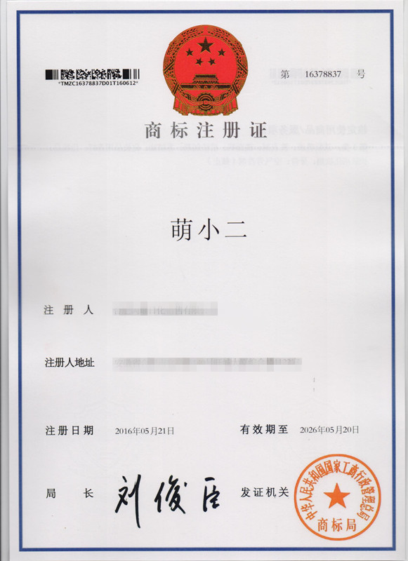 第3类“萌小二”商标注册证