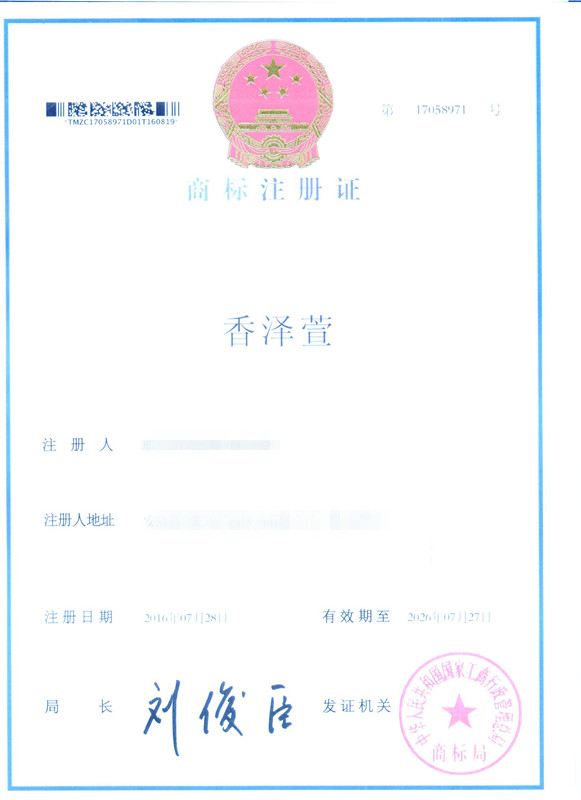 第25类“香泽萱”商标注册证