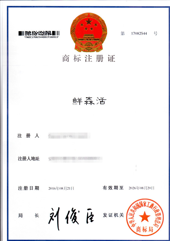 第35类“鲜森活”商标注册证