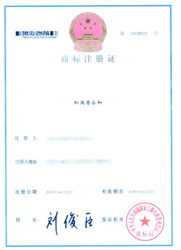 第43类“和满居永和”商标注册证