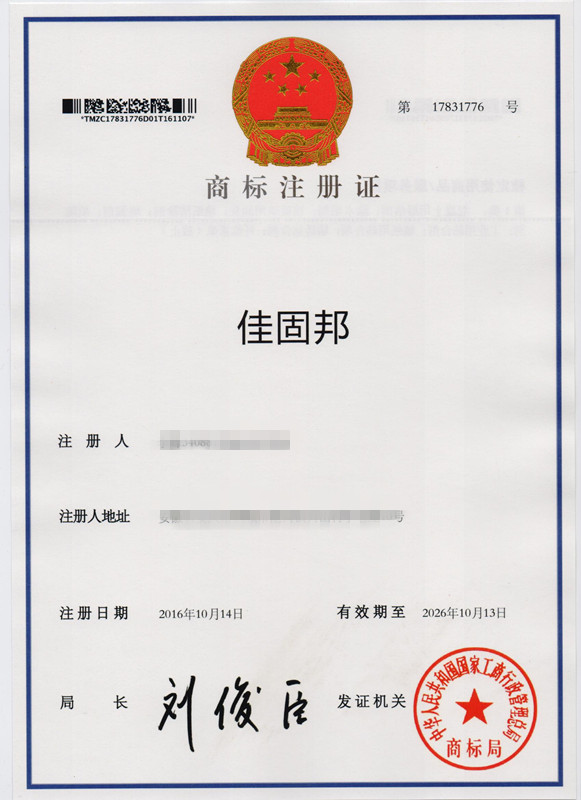 第1类“佳固邦”商标注册证