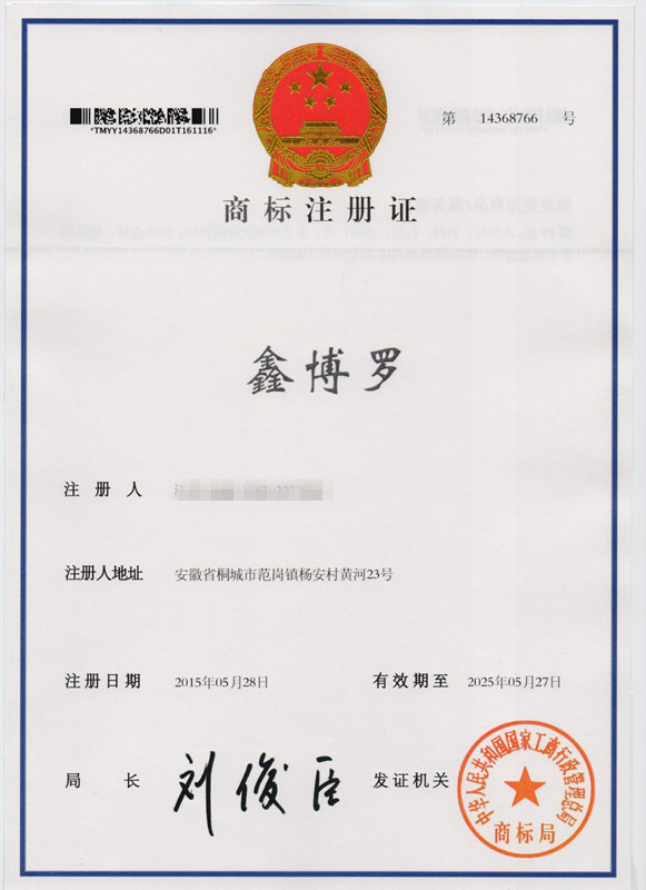 第19类“鑫博罗”商标注册证