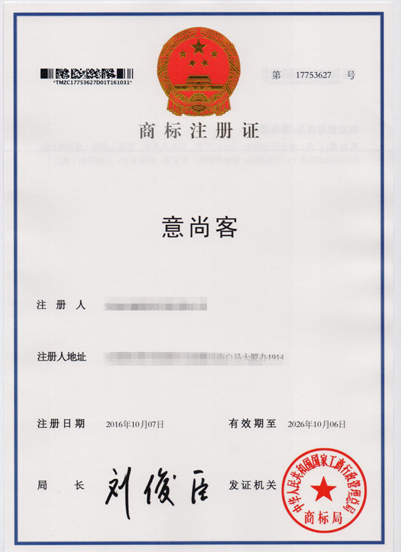 第35类“意尚客”商标注册证