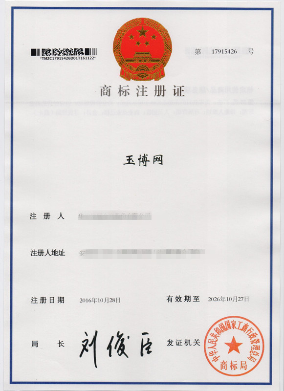 第35类“玉博网”商标注册证