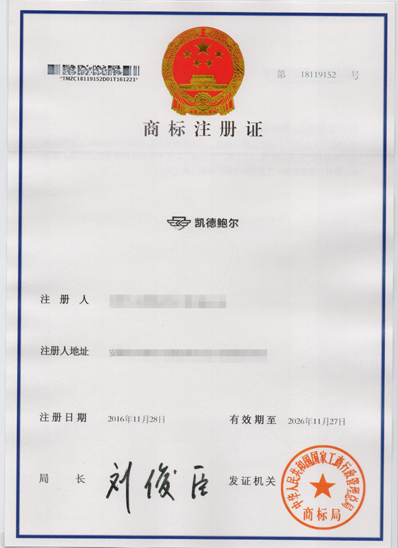 第1类“凯德鲍尔”商标注册证