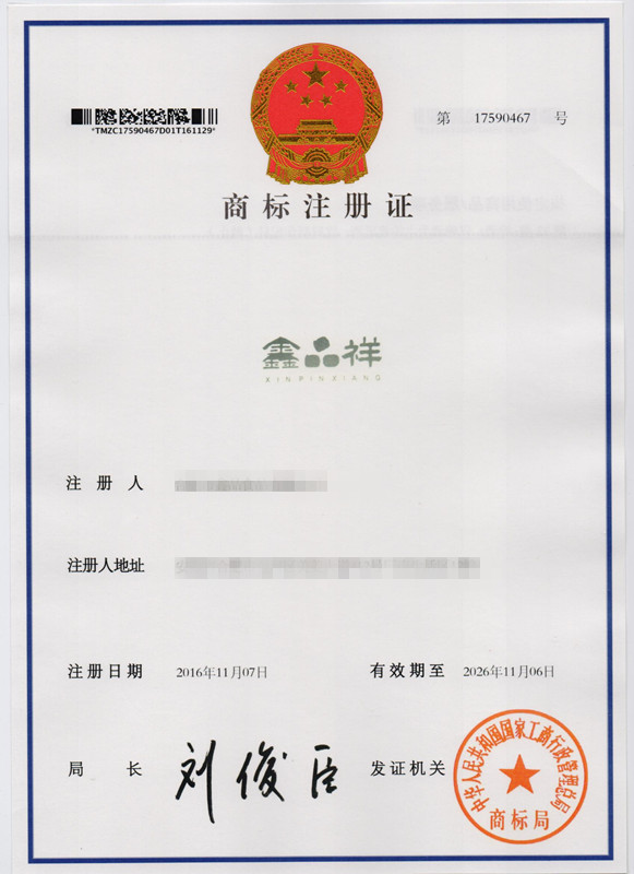第32类“鑫品祥”商标注册证