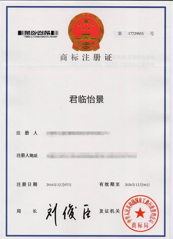 第43类“君临怡景”商标注册证