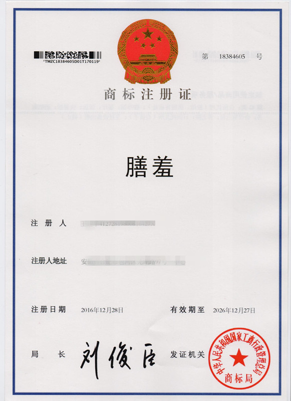 第43类“膳羞”商标注册证
