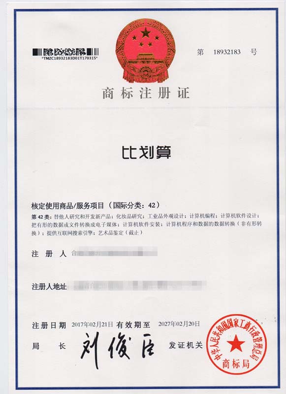 第42类“比划算”商标注册证
