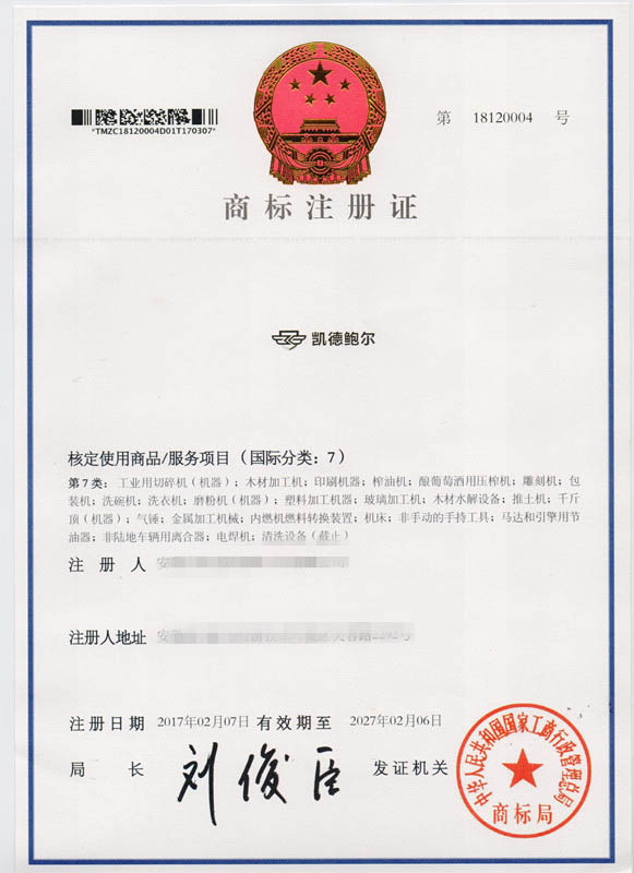 第7类“凯德鲍尔”商标注册证
