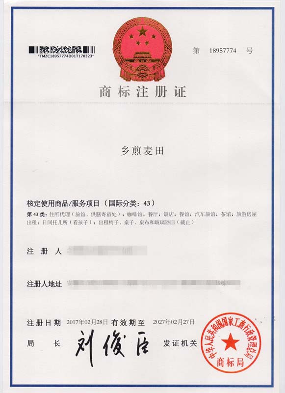 第43类“想煎麦田”商标注册证