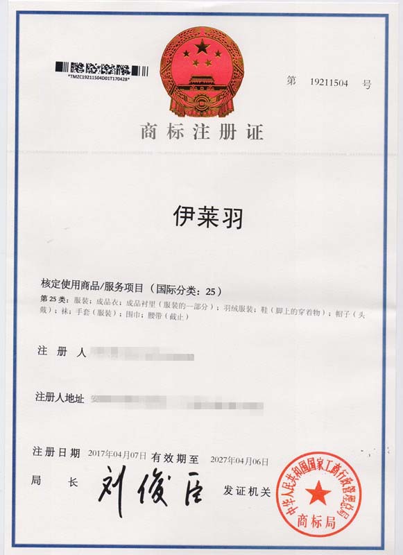 第25类“伊莱羽”商标注册证