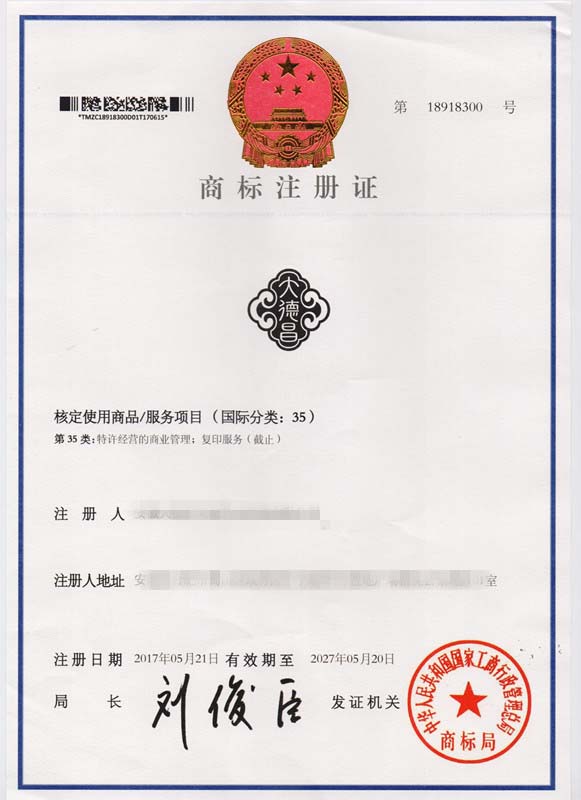 第35类“大德昌”商标注册证