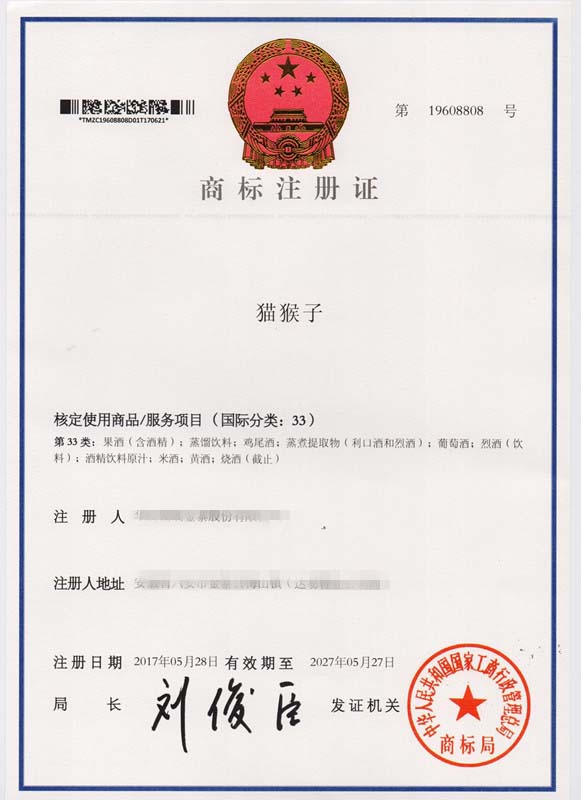 第33类“猫猴子”商标注册证