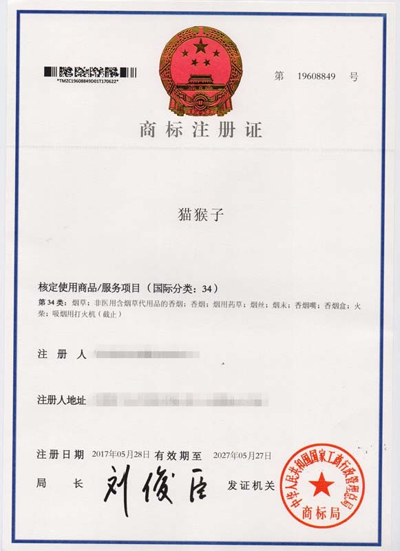 第34类“猫猴子”商标注册证