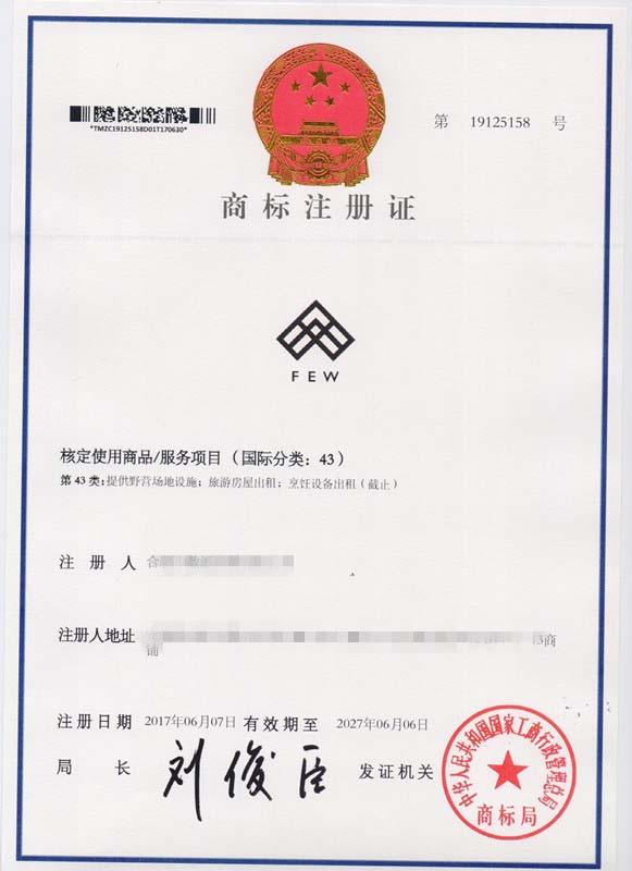第43类“FEW”商标注册证