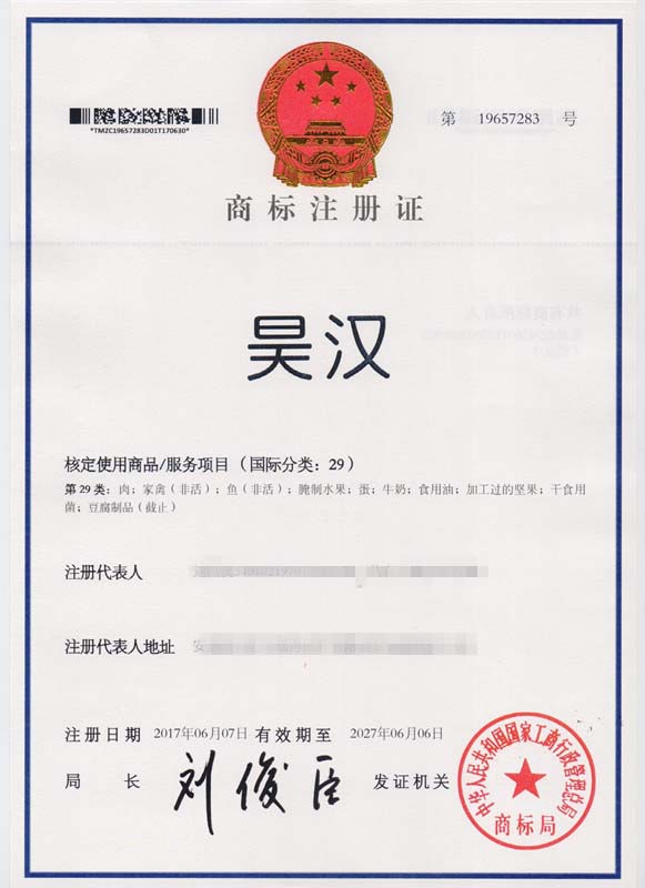 第29类“昊汉”商标注册证