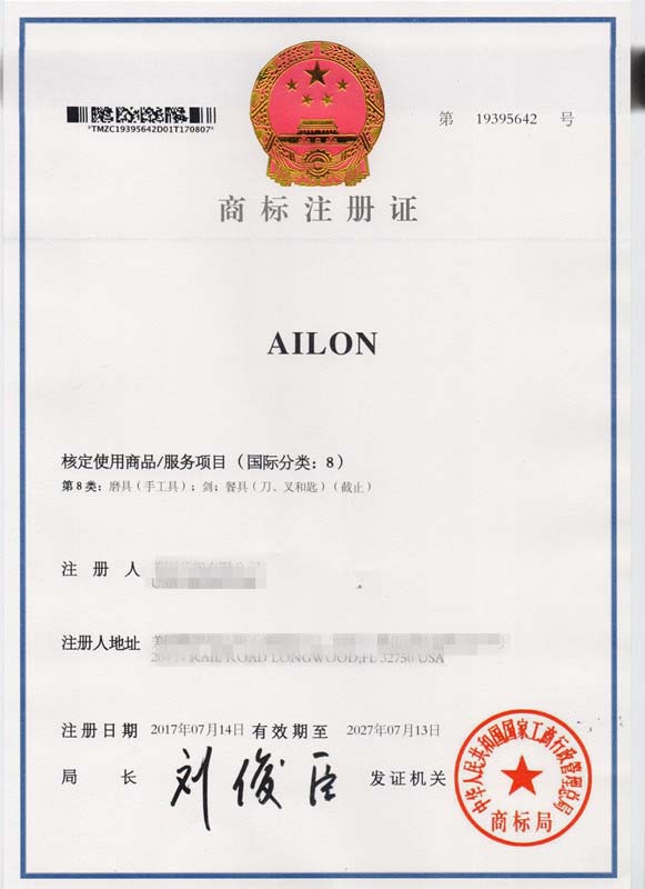 第8类“AILON”商标注册证
