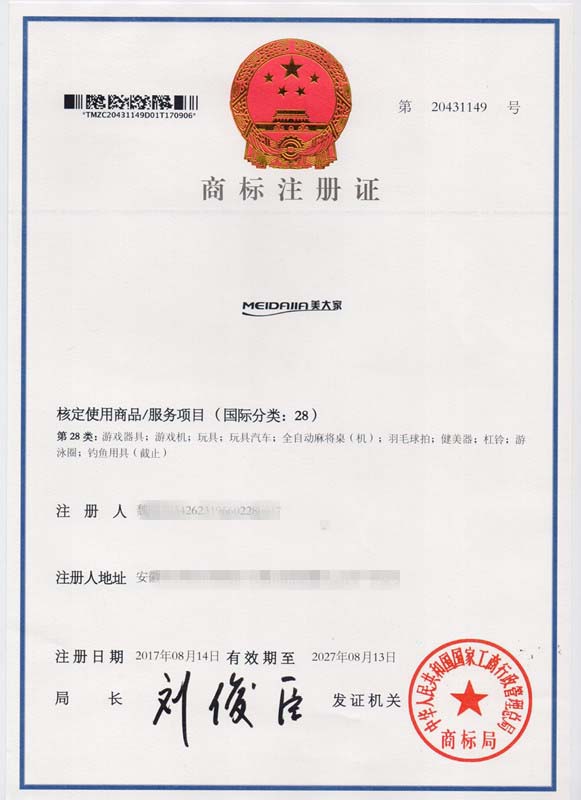 第28类“美大家MEIDAJIA”商标注册证
