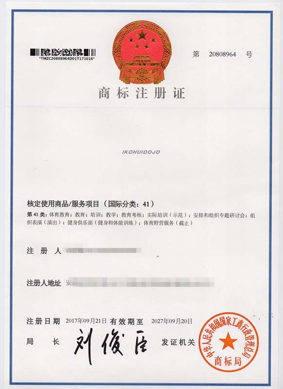 第41类“IKOHUIDOJO”商标注册证