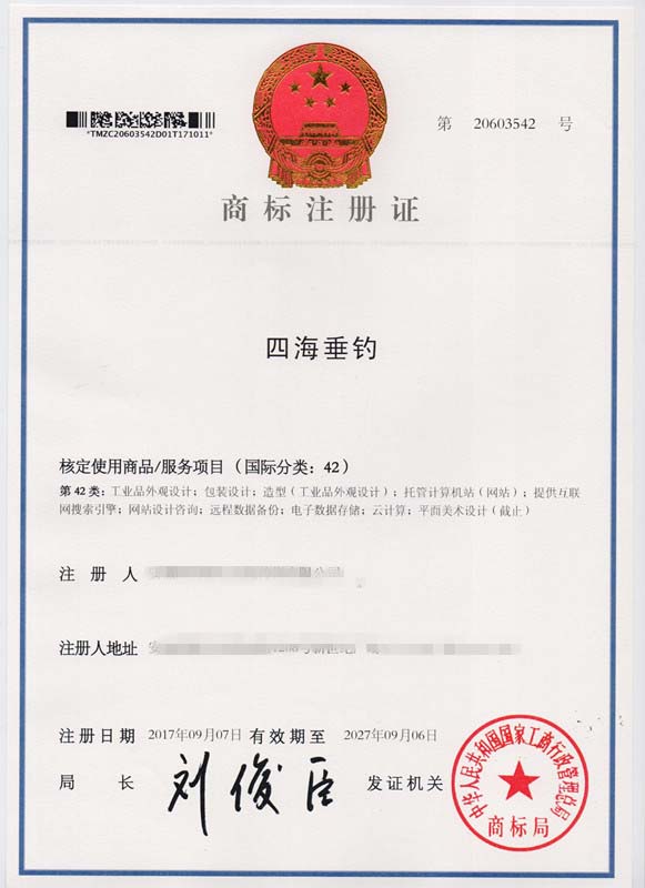 第42类“四海垂钓”商标注册证