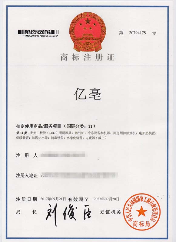 第11类“亳亿”商标注册证