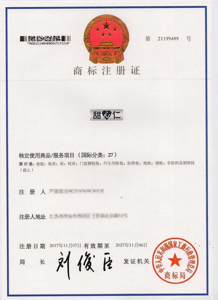 第27类“甜心仁”商标注册证
