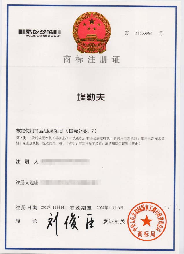 第7类“埃勒夫”商标注册证