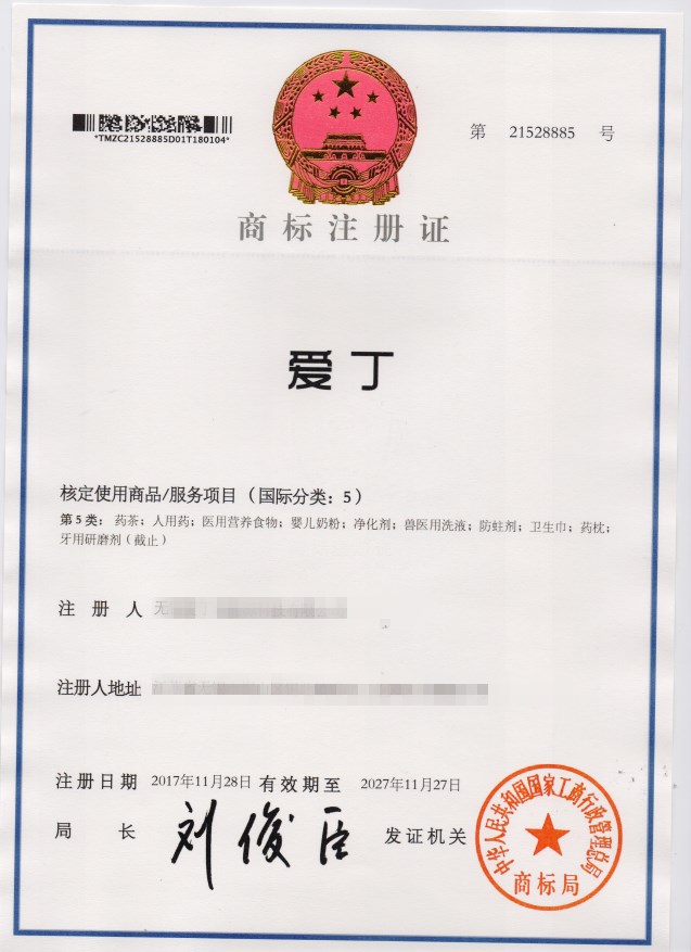 第5类“爱丁”商标注册证