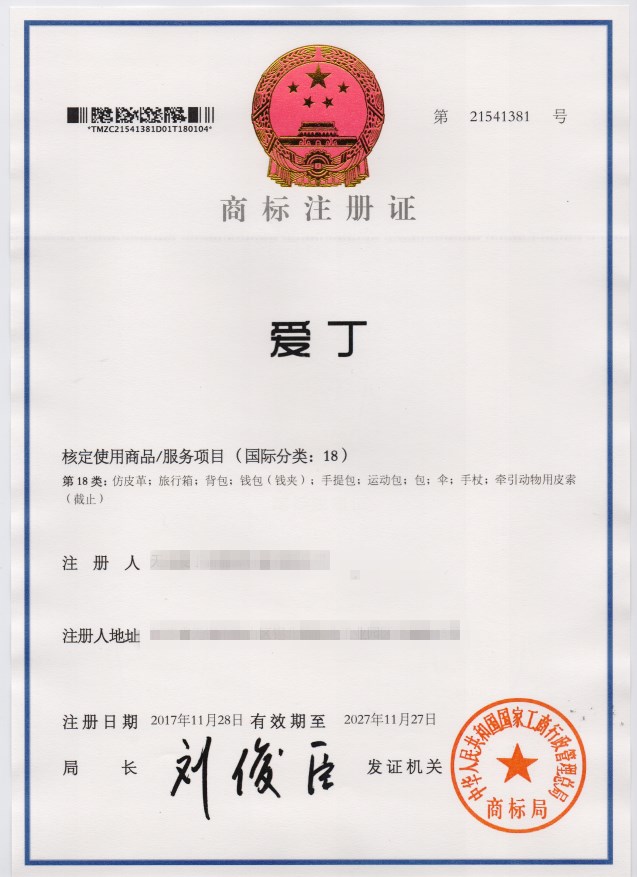第18类“爱丁”商标注册证