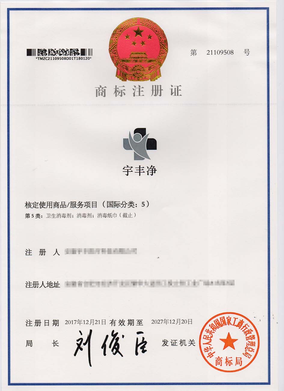 第5类“宇丰净”商标注册证